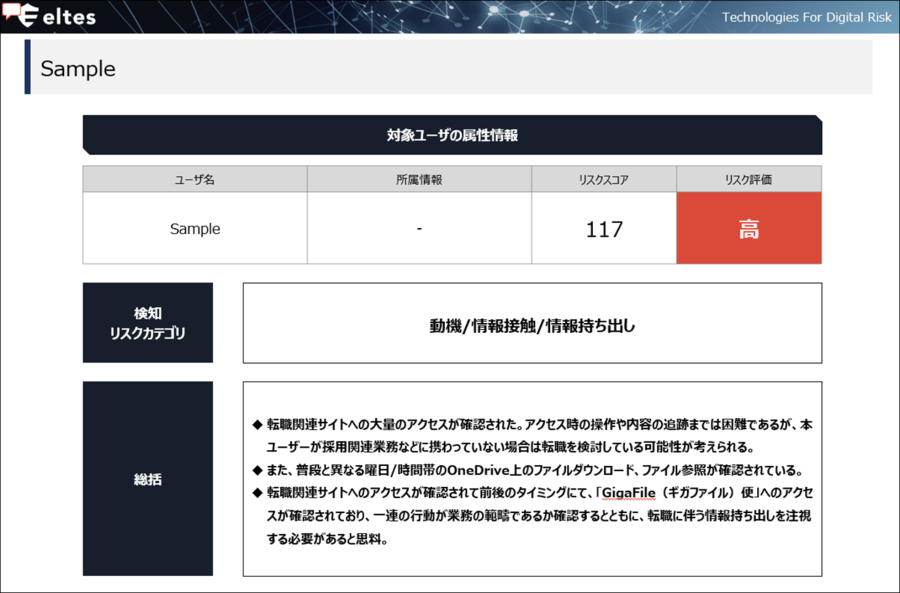 情報セキュリティ領域(情報持ち出しリスク)に加え、人事労務・コンプライアンス領域(労務リスク・離職兆候・ハラスメント兆候など)まで検知。例えば、転職サイトの閲覧や、終業時間を大きく超えてのPC利用などの複数の履歴から就業環境への不満による転職リスク等の予兆検知が可能です。ツール提供にとどまる海外製品とは一線を画し、人的資本経営の文脈にも応える数少ない国内サービスです。