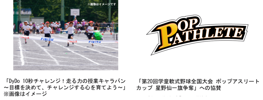 2026年度は、授業を通じて子どもたちの体力・走力向上を図るとともに、明確な目標を設定してチャレンジする楽しさや自己肯定感を育むことを目的とした「DyDo 10秒チャレンジ!走る力の授業キャラバン~目標を決めて、チャレンジする心を育てよう~」、子どもたちの健全な成長および地域スポーツ文化の発展への寄与を目的とした「第20回学童軟式野球全国大会 ポップアスリートカップ 星野仙一旗争奪」への協賛、ならびに資源の有効活用や環境意識の醸成につながるアップサイクル活動などを、新たな活動として実施いたします。