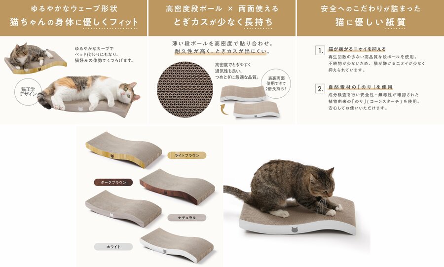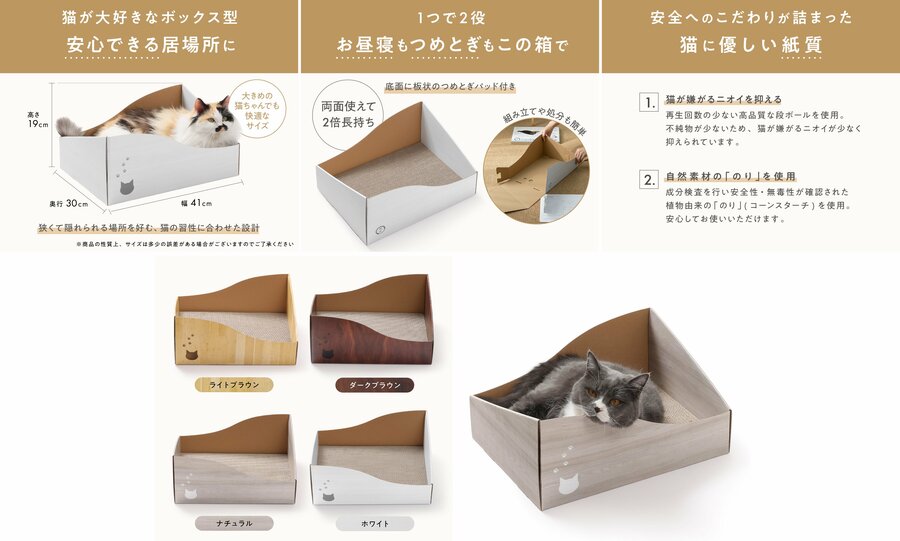 「くつろぐ×爪とぎ」「隠れる×爪とぎ」を両立し、猫の日常の行動に寄り添ったデザインが特長です。