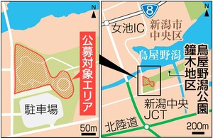 新潟県が県立公園で初めての導入を目指す「パークPFI」(公募設置管理制度)を巡り、鳥屋野潟公園鐘木地区(新潟市中央区)での参加を表明していた事業者が昨年12月に辞退したことが15日、分かった。建設費や資材の高騰で事業者が断念したという。県は募集の条件を定めた指針を見直し再公募する方針だが、年単位の時間がかかる可能性もあり、めどは立っていない。