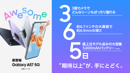 「365日“期待以上”が、手にとどく。」というフレーズで、「Samsung Galaxy A57 5G」の特長である3眼カメラ、約6.7インチ大画面と約6.9mmの薄さ、そして最上位モデル並みの大容量5,000mAhバッテリーを伝えています。