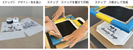 牛乳石鹸の代表商品「赤箱」のロゴデザインを使用した「シルクスクリーン印刷体験」では、Tシャツやバッグなど、お好きな素材に印刷することで、世界にひとつだけのオリジナル赤箱グッズが制作できます。素材はお持ち込み可能なほか、会場でのご購入にも対応しており、気軽にご参加いただけます。