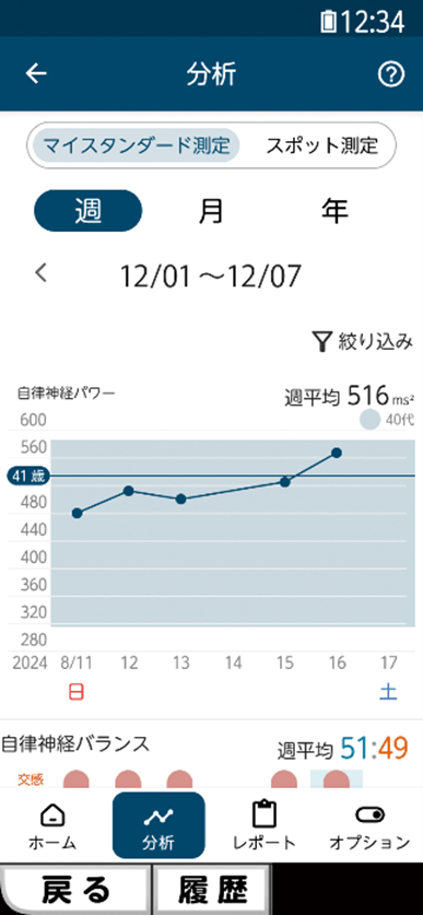 測定結果はレポート画面からいつでも見返すことができます。またアプリ内では自律神経を鍛える行動を紹介しており、森谷敏夫 京都大学名誉教授が長年の研究で培った改善方法を通じた、健康的な生活習慣の実践をサポートします。