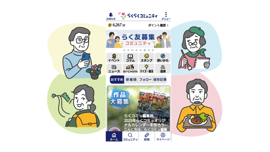 また、プリインストールされているらくらくコミュニティでは、撮影した写真をはじめとした共通の趣味の話題やイベントを通じて、同世代のユーザーとの交流やつながりをサポートします。