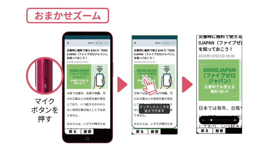 またマイクボタンを押すことで、見づらい画面や文字を簡単に拡大できる「おまかせズーム機能」を搭載しています。