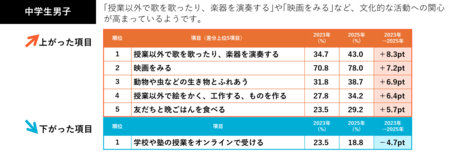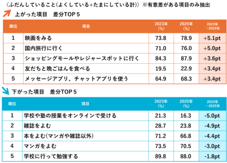 〈ふだんしていること〉では、ふだんの生活の中でのさまざまな体験、71項目について聴取しています。2023年から2025年でスコア**が上がった項目の差分上位を見ると、「映画をみる(2023年から+5.1pt、以下同)」が1位になったほか、「国内旅行に行く(+5.0pt)」「ショッピングモールやレジャースポットに行く(+3.6pt)」といった“お出かけ”関連の項目が上位にあがりました。