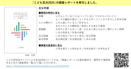 公益財団法人博報堂教育財団の調査研究機関こども研究所は、子どもの中長期的な変化を見る時系列調査「こども定点2025」を実施しました。本調査は、子どもを“体験を通して成長する主体的な存在”ととらえ、「体験」を起点に、「人との関わり」「意識・価値観」「自己認識」など幅広い分野で聴取しています。2023年にスタートし、今回で3回目を迎えました。