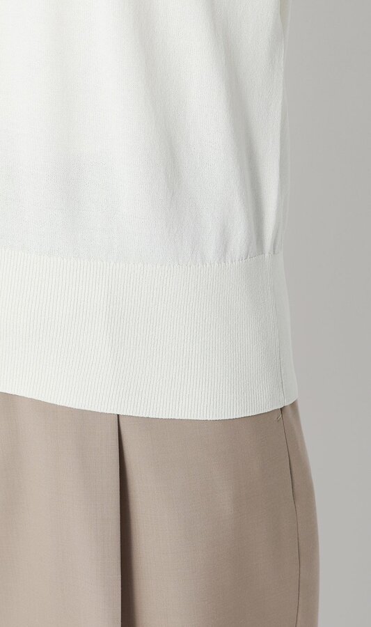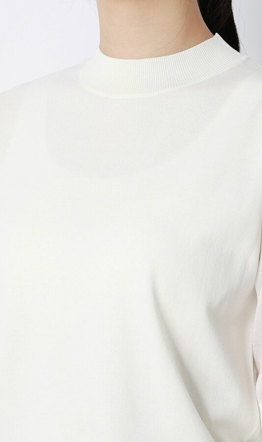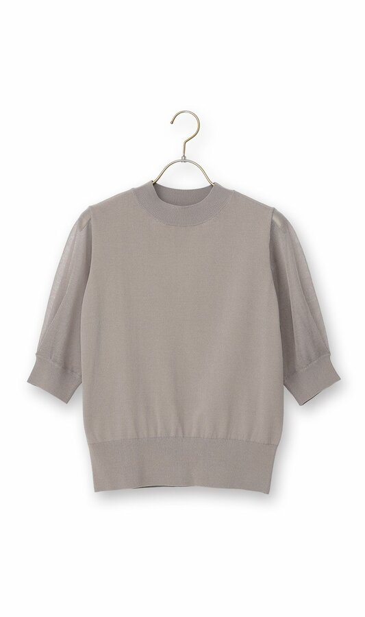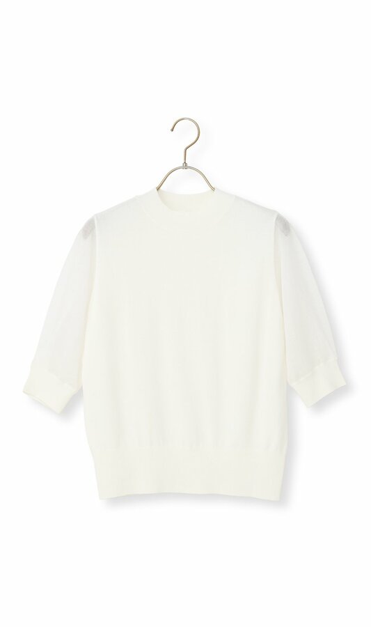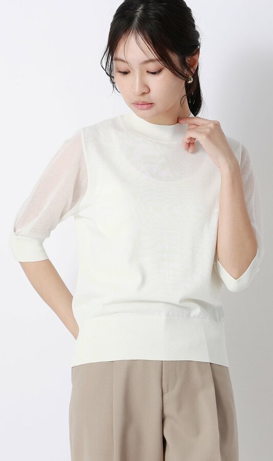 商品の身頃部分は、細い糸を高密度に編み立てることで表面の凹凸を抑え、滑らかで柔らかな肌触りに仕上げています。デザインは、気になる二の腕をさりげなく隠せる5分袖に加え、襟元は少し詰まり気味のハイネック仕様にすることで、首周りをすっきり見せつつきちんとした印象に。さらに、自宅の洗濯機で洗えるマシンウォッシャブルや、毛玉になりにくい抗ピリング素材を採用しているため、イージーケア性にも優れています。暑い夏に向けて、気軽にトレンドを取り入れながら一枚でも透けを気にせず着用できるアイテムです。