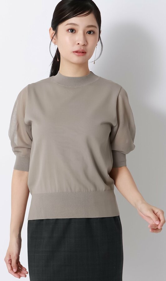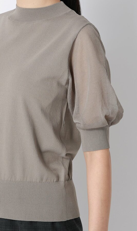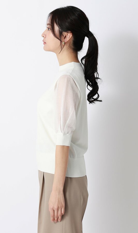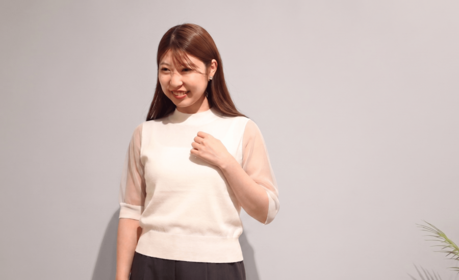 レディースファッションにおけるシアー素材のアイテムは、視覚的な涼しさや、上品な肌見せでこなれ感を演出できる商品として注目を集めています。その一方で、アウターとしての重ね着を前提とすることが多いため、「色や肌見せの加減に悩む」「インナーの選択が難しい」といった、トレンドを取り入れたいものの気軽に着用しにくい一面があります。そこで今回、身頃は透けさせずに袖部分のみシアー素材を使用したニットを企画。一枚でも安心して着用でき、トレンドの「抜け感」とビジネスシーンに必須の「きちんと感」を両立しました。