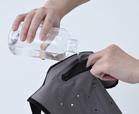「Mizu fit」はベスト内部に水を浸透させ、浸透させた水の冷たさに加え、外側から徐々に蒸発する際の気化熱によって身体を冷やす冷却ウェアで、水を入れるだけで使用できる手軽さが特長です。ファン付きウェアのインナーとしても使用でき、暑さ対策アイテムとして幅広いシーンで活用できます。