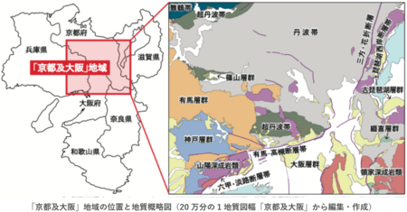 国立研究開発法人産業技術総合研究所(以下「産総研」という)は、京阪神都市圏を含む近畿地方北部に位置する20万分の1地質図幅「京都及大阪」(第2版)(以下「本図幅」という)を刊行しました。この地域における20万分の1地質図幅の刊行は、1986年の初版に続き40年ぶりの改訂となります。この地域には、西南日本内帯の主要な地質区に属する多様な地層・岩石が分布しており、これらは古生代後半(約4億年前)から新生代(現在まで)にかけての異なる地質条件のもとで形成されました。3年間にわたって実施された150日以上の野外地質調査と、岩石の放射年代測定に加え、1980年代後半から最近までに得られた最新の地質情報と学術的新知見を取り入れた結果、初版では52であった凡例数が第2版では113に倍増しました。つまり、地層・岩石がより細かな単位に区分された詳細な地質図となっています。これらのことから本図幅は、京阪神都市圏の地形・地質の成り立ちを知るうえで重要な研究成果の一つであるといえます。