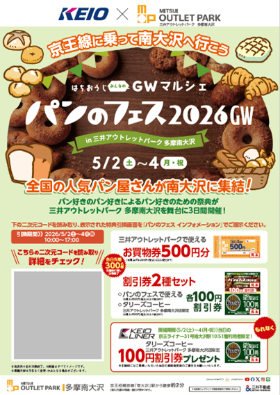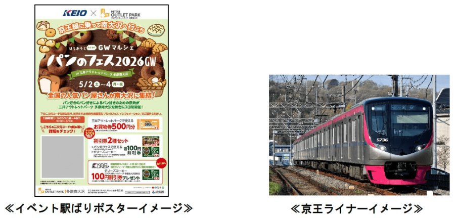京王電鉄株式会社(本社:東京都多摩市、代表取締役社長:都村 智史、以下「京王電鉄」)では、三井不動産商業マネジメント株式会社(本社:東京都中央区、代表取締役社長:大林 修)が主催する「はちおうじみんなのGWマルシェ『パンのフェス2026GW in 三井アウトレットパーク 多摩南大沢』(以下、「パンのフェス」)」が5月2日(土)から5月4日(月・祝)まで開催されることにあわせ、「パンのフェス」ならびに「三井アウトレットパーク 多摩南大沢」で利用できる「割引券・お買物券プレゼントキャンペーン」を実施します。