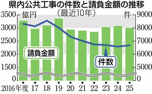 発注者別では国の請負金額が2・7%減の614億8500万円。北陸地方整備局は5・6%減の517億2900万円。前年にあった、朝日温海道路などの大型工事の反動が減少要因となった。