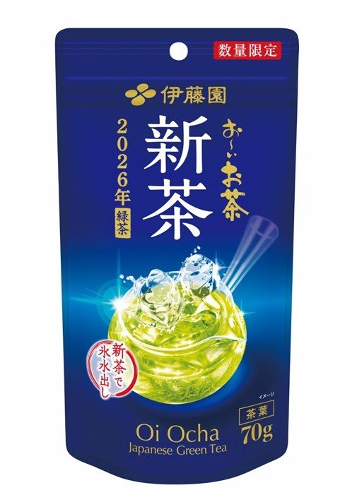 2026年産の「お~いお茶 新茶」は、鹿児島県産の茶葉を100%使用した、濃い緑色の水色と旨み豊かな濃厚な味わいが特長の、急須で楽しむ新茶リーフ製品です。新茶の特長である旨みが、氷水出しでいれていただくとさらに引き立ちます。パッケージデザインは、「新茶の氷水出しで、感動の冷茶体験を」をテーマに、氷水出しでいれる新茶の爽やかさやみずみずしい味わいを表現しています。