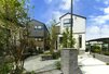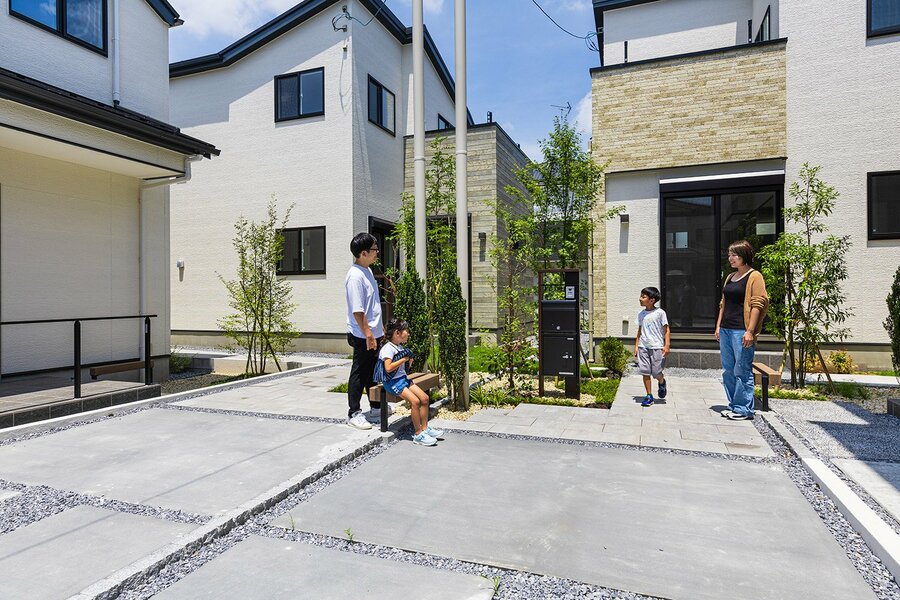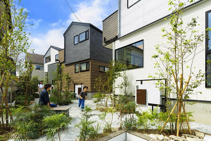 敷地延長部分のアプローチ空間を共有地として活用した3邸の分譲住宅です。2本の敷地延長によって接道する奥まった敷地は、本来であればデッドスペースになりやすい長い通路状の区画となりますが、本計画ではアプローチ部分にカースペース、共有広場、駐輪場を配置し住民全員が利用できるコモンスペースとして計画しました。広場にはベンチ、豊かな植栽、照明を設けることで美しい景観と住民の憩いの場を創出しています。