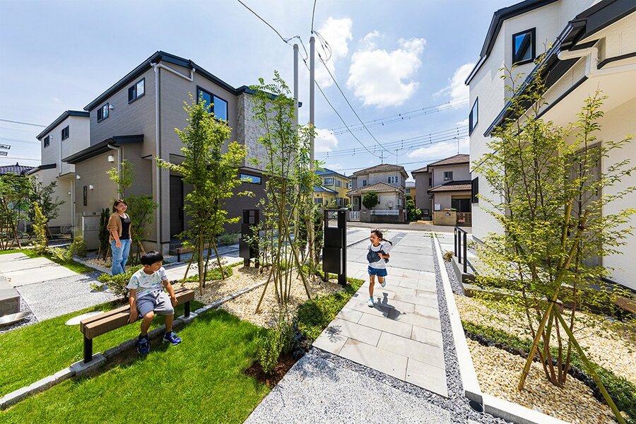住民同士が自然とお互いを意識できる安心・安全な暮らし方を提案した30邸の分譲住宅です。道路に面した整形地と旗竿地が連続した区画となっており、通常の計画では余白にある「スキマ」は有効活用されず、アプローチとして完結してしまいます。そこで、敷地境界をシームレスにして、1戸では「スキマ」だった空間同士をつなげることで、広場となる「コア」へ昇華させました。「コア」は、樹木を中心とした空間を基本とし、ベンチ等を設置し、住民が立ち寄りたくなる工夫を施すことによって、自然なコミュニティの形成を促します。