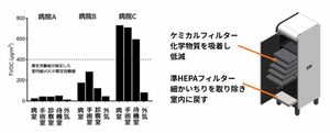 空気中に含まれるVOCは、室内を汚す要因の一つとして近年注目されています。しかし、医療施設では薬剤や建材由来の化学物質による室内空気汚染が起こり得るものの、この問題に関する研究は十分におこなわれていません。また、換気設備が十分でない物件で開業した医療施設では市販の家庭用空気清浄機が使われることがありますが、化学物質の低減効果が求められる水準に達しない場合があります。