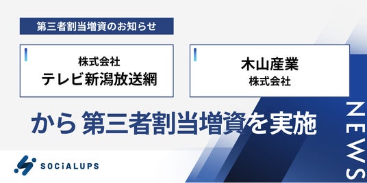起業家支援および新規事業開発支援を手がけるSocialups株式会社(本社:新潟県新潟市、代表取締役:高瀬 章充、以下「Socialups」)は、2026年4月、株式会社テレビ新潟放送網(本社:新潟県新潟市、代表取締役社長:正力 源一郎、以下「TeNY」)および木山産業株式会社(本社:新潟県新潟市、代表取締役社長:木山 光、以下「木山産業」)を引受先とする第三者割当増資を実施いたしました。