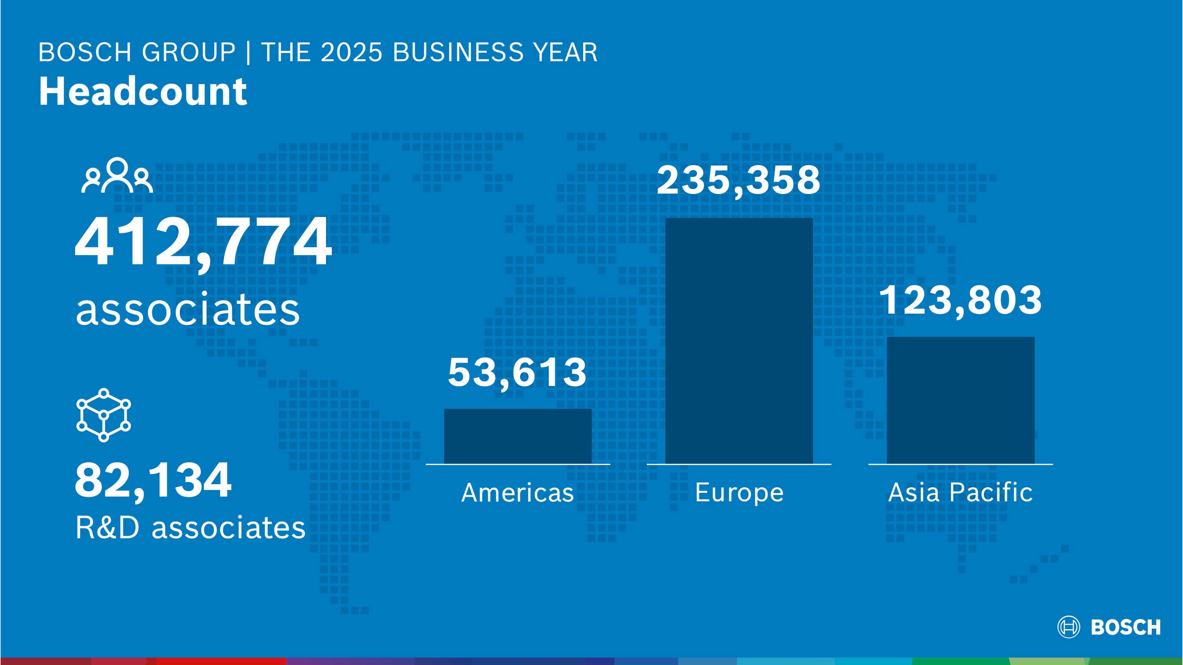 2025年末時点で、ボッシュ・グループの全世界の従業員数は41万2,774人で(2024年:41万7,859人)、約1%(5,085人)減少しました。この影響が最も大きかったのはモビリティ事業セクターで、地域別ではドイツに最も大きく現れました。