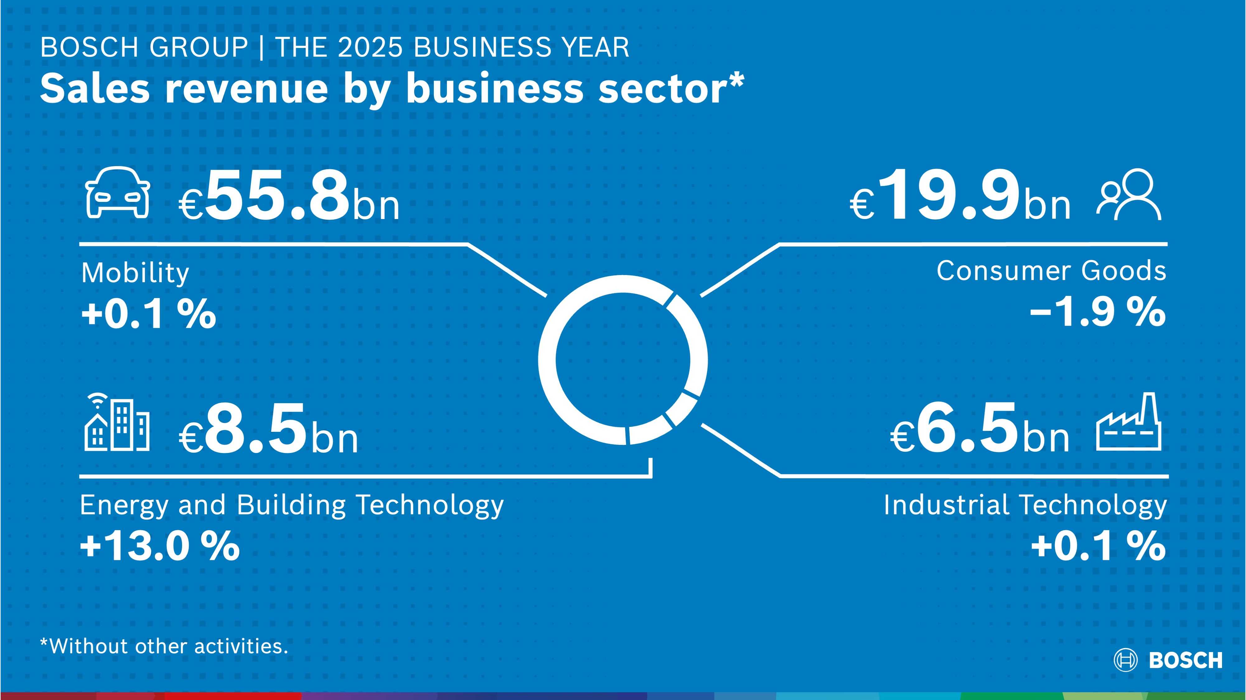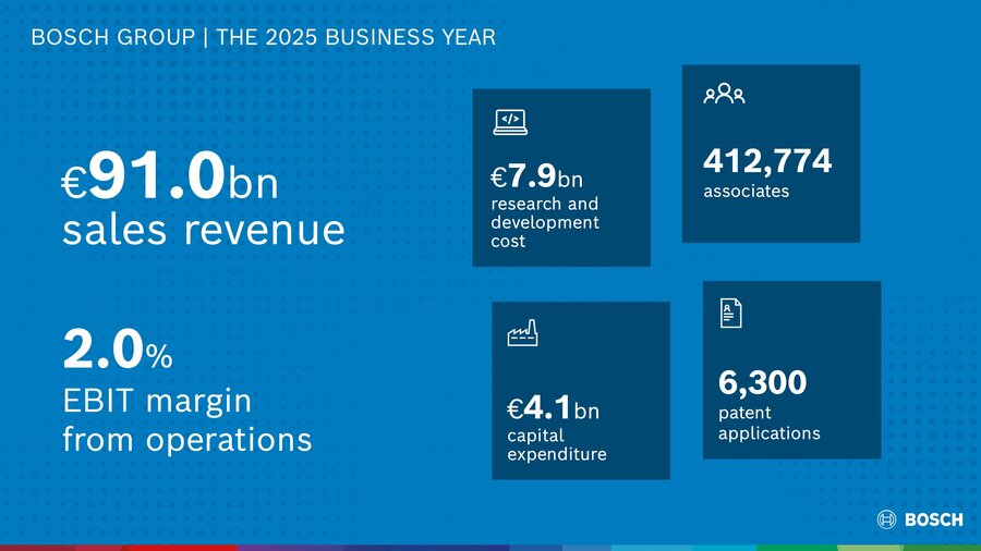 シュトゥットガルトガルトおよびレニンゲン(ドイツ) – ボッシュ・グループは2026年度、地政学的な緊張や貿易障壁に直面しながらも、技術革新力を最大限に発揮し、グローバル市場における成長機会を追求していきます。将来の重要分野への先行投資は、従来と同じ高水準を維持する予定です。ボッシュは、2025年だけで研究開発と設備投資に約120億ユーロを投じました。グローバル規模で革新的なテクノロジーとサービスを提供するボッシュは、2026年の売上成長率を2~5%、事業からの支払金利税金控除前利益率を4~6%と見込んでいます。ロバート・ボッシュGmbH取締役会会長のシュテファン・ハルトゥングは、年次記者会見で次のように述べました。「ボッシュはグローバルなテクノロジーリーダーとして、自動化、デジタライゼーション、電動化、そしてAIのトレンドを形成することに注力しています。これらは、当社事業における収益性の高い成長への道筋となるものです。そのための重要な前提条件となるのは、すでに着手している構造調整によるコスト削減効果および全事業分野における技術革新です」。技術革新力という点では、ボッシュは世界有数の産業企業であり、欧州で最も多くの特許を出願している企業のひとつです。ボッシュは2025年、約6,300件の特許を登録し、またしてもドイツで首位の座を獲得しました。2025年度は厳しい事業環境にもかかわらず、売上高は910億ユーロを達成し、前年の903億ユーロをわずかに上回りました。これは為替調整後で4.1%の成長に相当します。事業からの支払金利税金控除前利益率は2.0%で、前年の3.5%を下回りました。将来の存続可能性を高めるため、必要な組織と人員の構造調整を実施し、27億ユーロの引当金を計上したことが、業績に大きく影響しました。