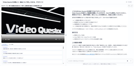 Video Questorは、動画をアップロードするだけでAIが自動的に内容を解析し、ユーザーがチャット形式で入力した質問や指示に対して、動画内容に基づいた回答を生成するサービスです。動画の要約、質疑応答、マニュアル作成、翻訳などを行うことができ、従来の「視聴するだけ」の動画活用から「対話しながら理解する」新しい体験を提供します。