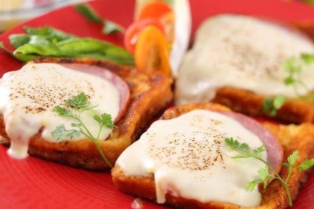 バター香るデニッシュをフレンチトーストに。厚切りハムと濃厚なソース・モルネーが溶け合う、芳醇で甘じょっぱさが魅力の一品。