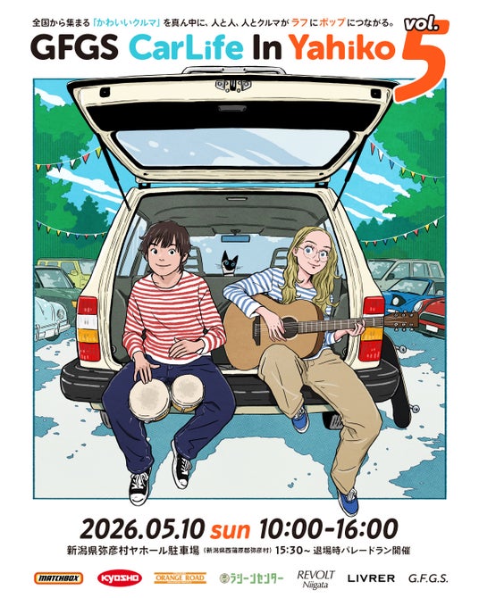 「人とクルマが寄り添うPOPな交流を」をコンセプトに新潟県内外から多数の「カワイイ!」クルマがあつまるラフ&ポップなカーミーティング「GFGS CaLife(ジーエフジーエス カーライフ)は2026年5月10日(日)新潟県西蒲原郡弥彦村にあるヤホール前駐車場にて「GFGS CarLife In Yahiko vol.5」開催します。