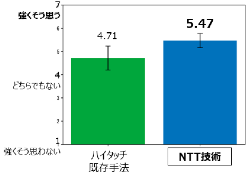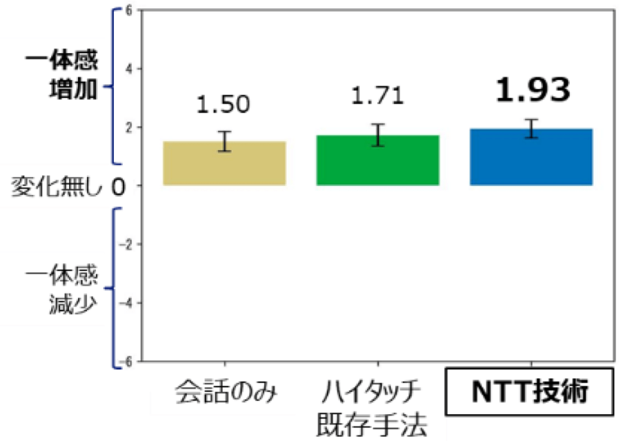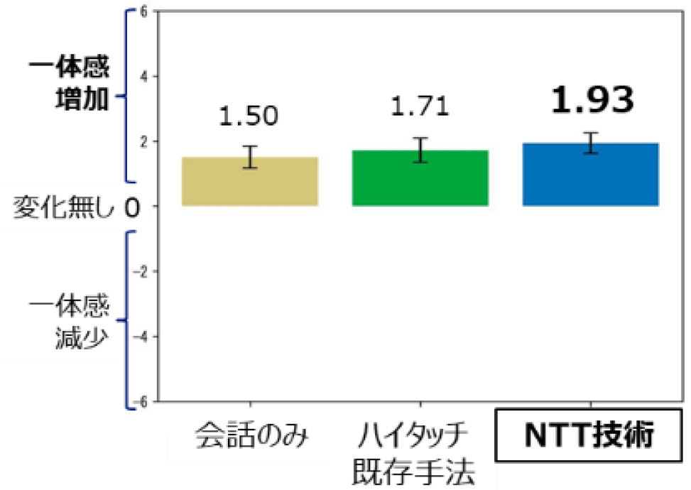 VRファンミーティング実験参加者(計39名)を対象に実施したアンケートの結果、NTTの技術について、「ハイタッチをした感覚」や「バーチャルキャラクターとの一体感」などの項目において高い評価を得ることができました(図6~8)。