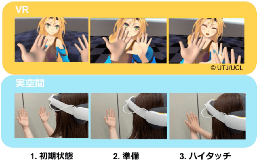 (2)NTTが研究開発したセルフハプティクスによるVR触覚コミュニケーション技術により、VR空間において推しとハイタッチした際の触覚を実感できることを実証