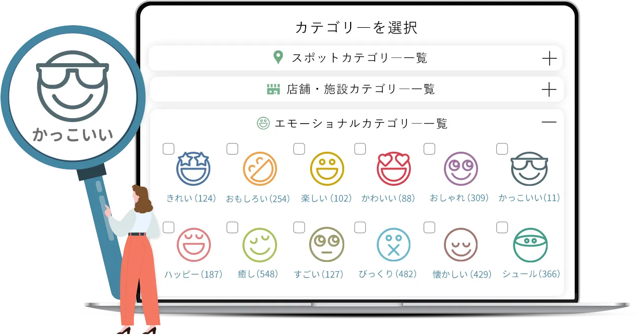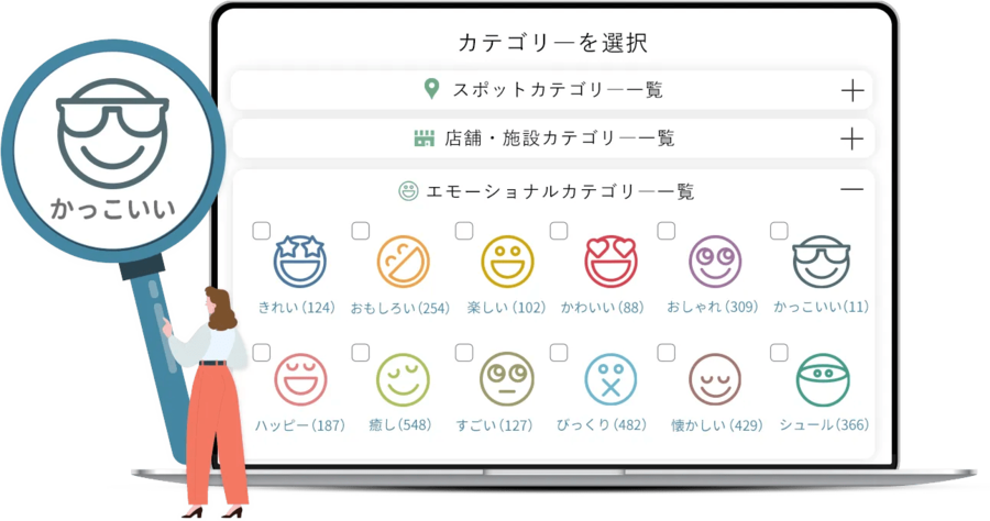 「ワクワクしたい」「癒されたい」など、「何をするか」ではなく、「今の気分や感情」に合ったスポットを探せるエモーショナル検索で、思いがけない新しい出会いを楽しめます。