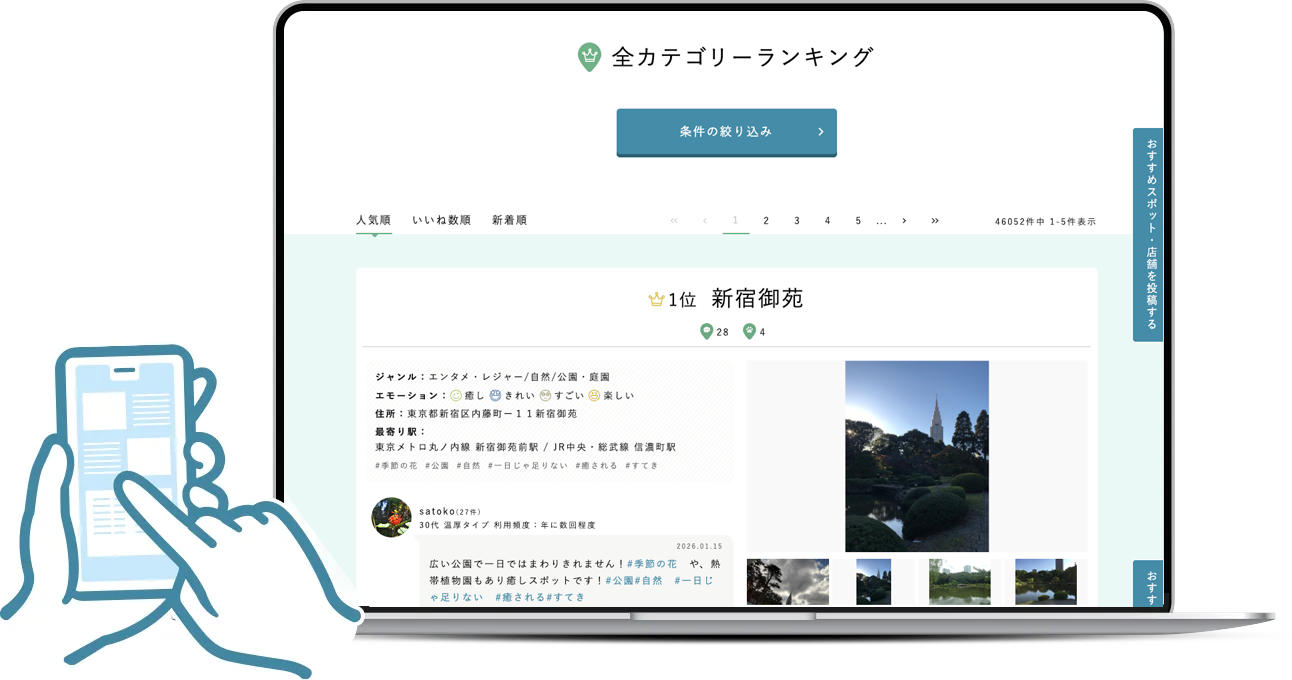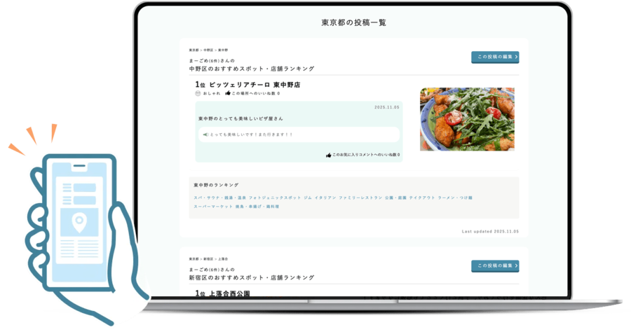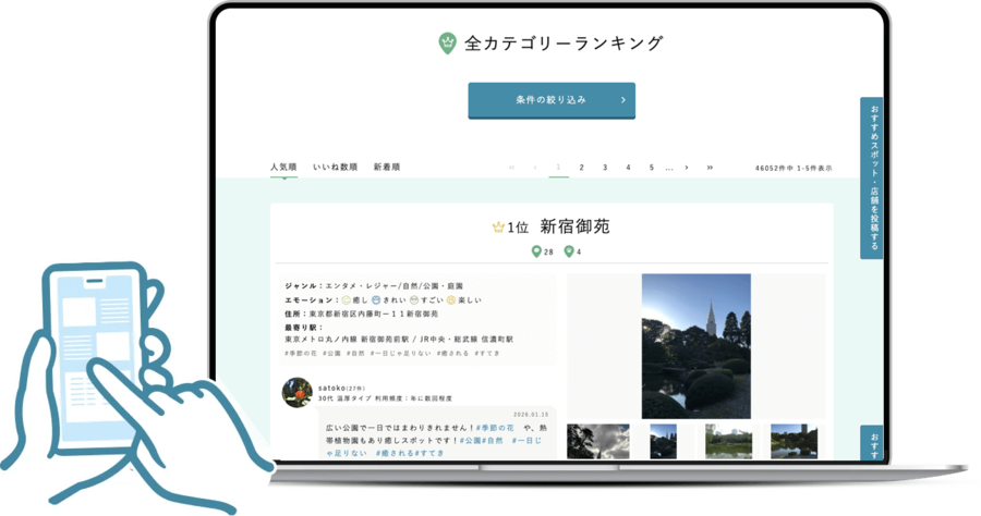 市区町村や駅ごとに、おすすめのスポットやお店がランキング化されているため、地元での新発見や、旅行先でのスポット探しに役立ちます。