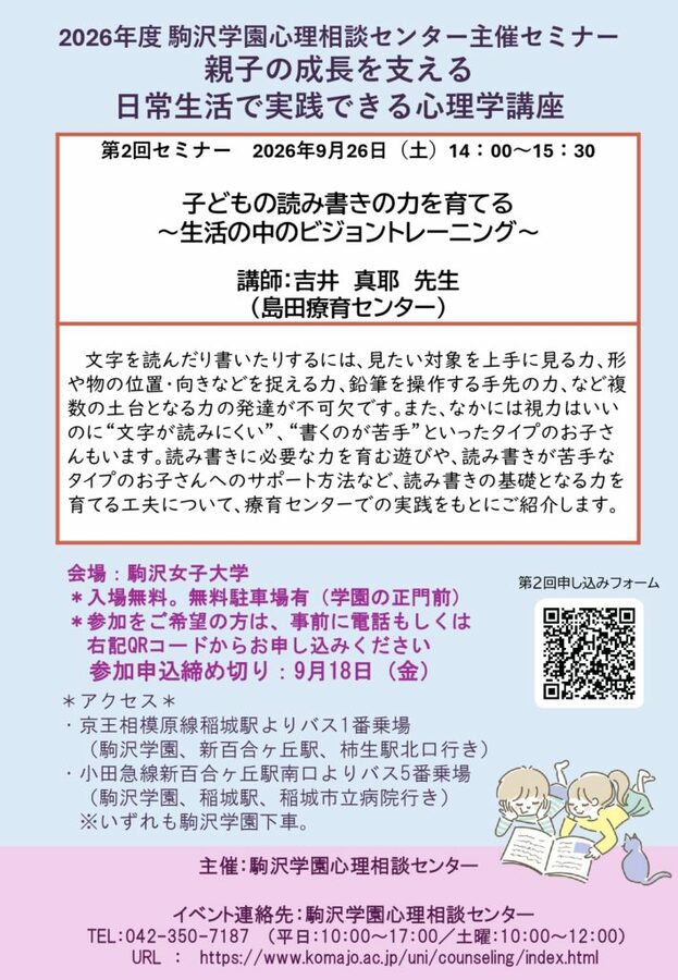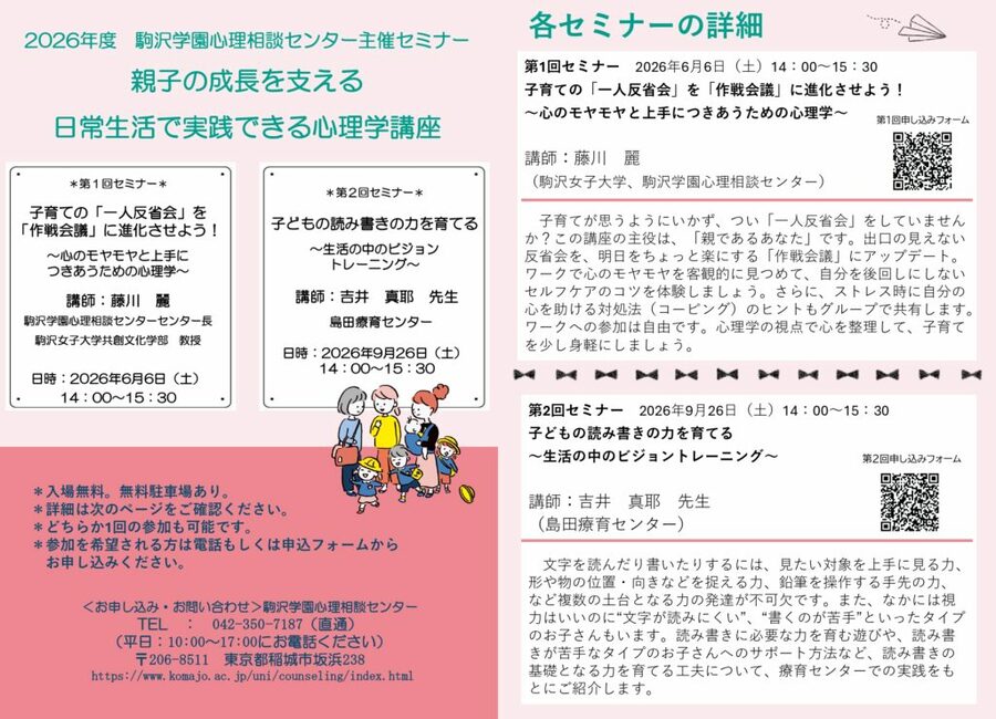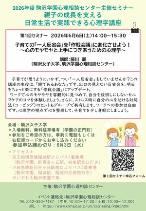 学校法人駒澤学園(東京都稲城市/理事長:葛城天快)では、2026年度駒沢学園心理相談センター主催セミナー「親子の成長を支える 日常生活で実践できる心理学講座」を開講する。6月6日(土)に同センターの藤川麗教授(駒沢女子大学共創文化学部心理学科)が講師を務め、第1回「子育ての『一人反省会』を『作戦会議』に進化させよう! ~心のモヤモヤと上手につきあうための心理学」を実施。9月26日(土)には島田療育センターの吉井真耶氏を招請し、第2回「子どもの読み書きの力を育てる ~生活の中のビジョントレーニング~」を行う。入場無料、要事前申し込み。