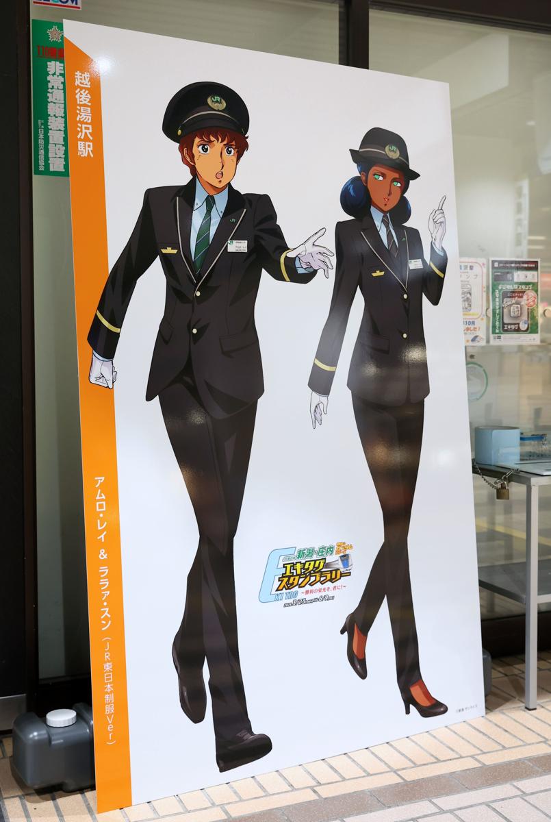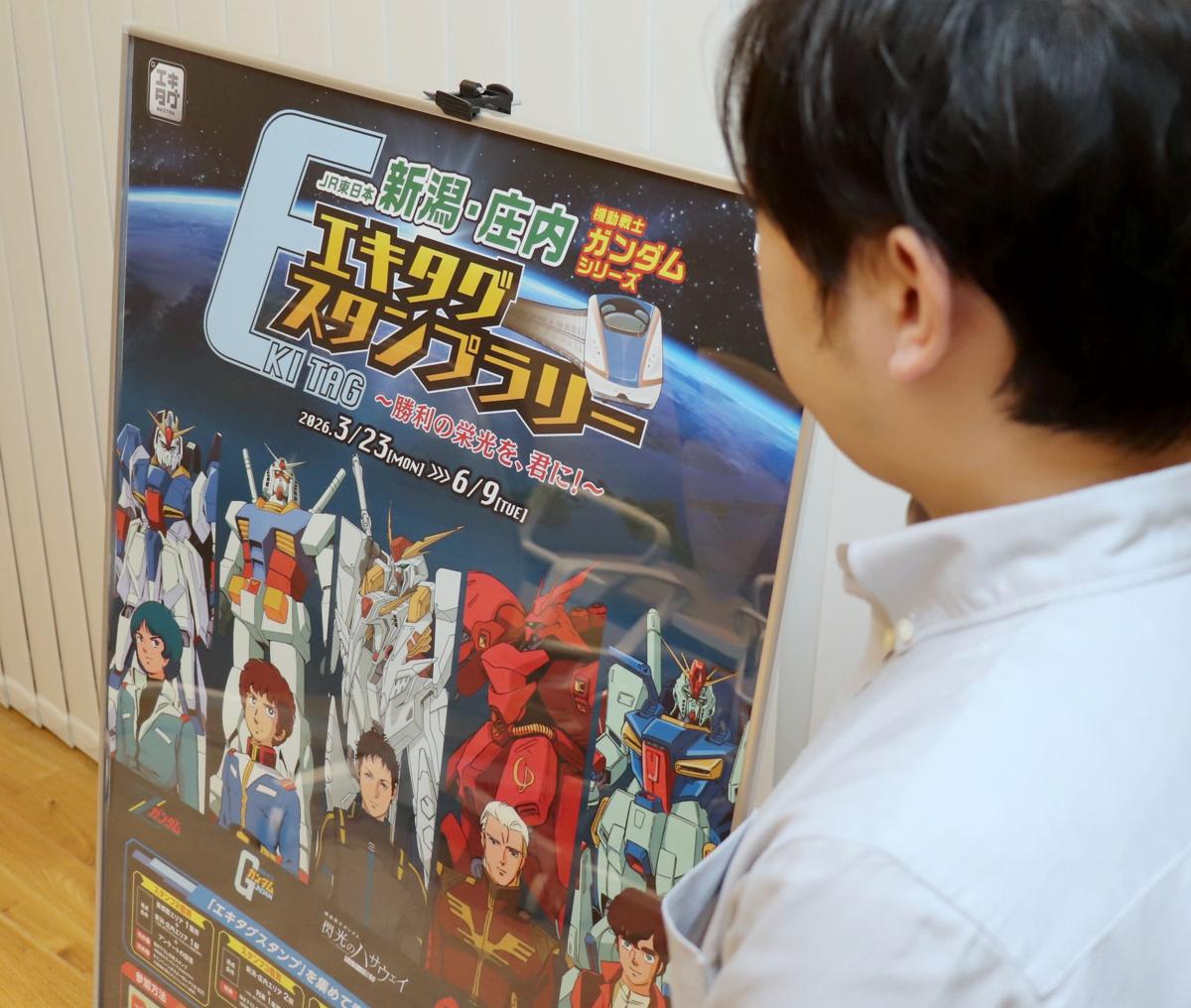 エキタグスタンプラリーのメインポスターと企画担当の「中の人」=JR東日本新潟支社 (C)創通・サンライズ