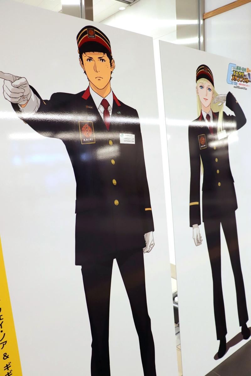 ハサウェイ・ノア&ギギ・アンダルシアのパネル。描き下ろしの「海里」の車掌制服姿=JR新潟駅 (C)創通・サンライズ