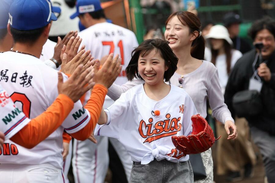 選手らと笑顔でハイタッチする、NHK Eテレ「みいつけた!」で4代目スイちゃんを務めた人気子役タレント・増田梨沙さん(中央)=長岡市悠久山
