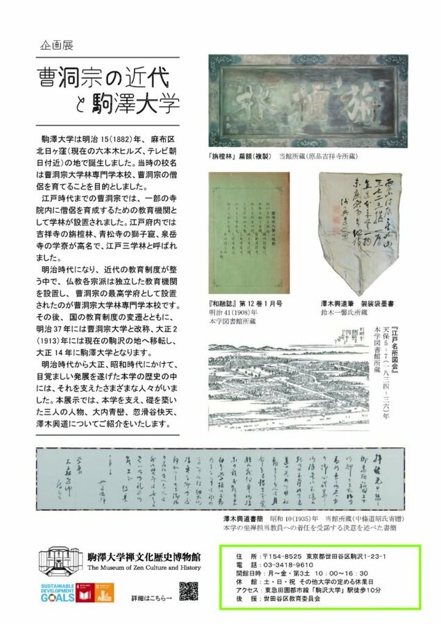 駒澤大学(学長:村松哲文/東京都世田谷区)禅文化歴史博物館では4月20日(月)~11月21日(土)まで、企画展「曹洞宗の近代と駒澤大学」を開催します(入館無料、予約不要)。駒澤大学の歩みと曹洞宗の近代化の歴史について、江戸時代の学林に関する資料や、「曹洞宗大学林」から「駒澤大学」への歩みを知ることができる資料などを展示。世界に広がる“ZEN”の源である、近代日本の禅の活きた姿を紹介します。また、6月19日(金)には、禅文化歴史博物館長で同大総合教育研究部の小川隆教授による関連セミナー「禅博でみる禅宗入門」を予定しています。(参加無料、要事前申込、定員150名(先着順))。