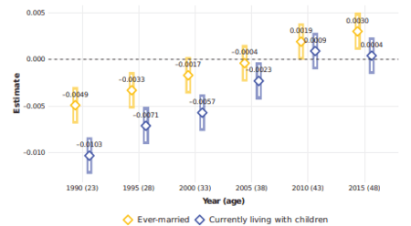 この図は、23歳から48歳までの各年齢において、教育機会をめぐる競争の緩和が家族形成に与える影響、教育の影響が年齢とともにどう変わるかを示しています。この図は、「これまでに結婚したか」と「現在子どもと同居しているか」という2つのアウトカムを追跡しており、若年期における遅れは徐々に小さくなり、40代半ばにはほぼ差がなくなることが分かります。これは、本研究の中心的な結論――女性の教育機会の拡大は家族形成のタイミングを遅らせるが、最終的な家族形成の達成度を低下させるものではない――を視覚的に示しています。