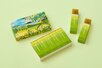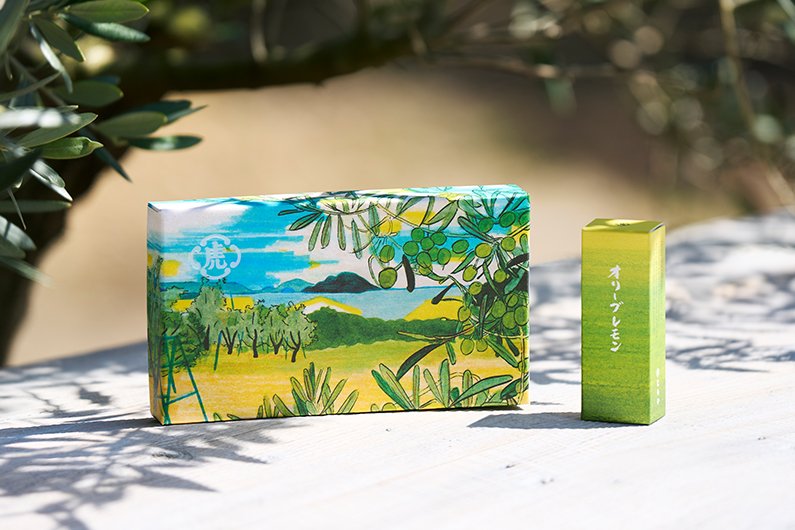 小豆島で採れた早摘みオリーブと瀬戸内産のレモン果皮を白餡に混ぜ、煉りあげた羊羹です。最初にレモンのさわやかな香りがたち、次第にオリーブの青々しい香りとコクのある味わいが感じられ、最後に白餡の風味が広がります。