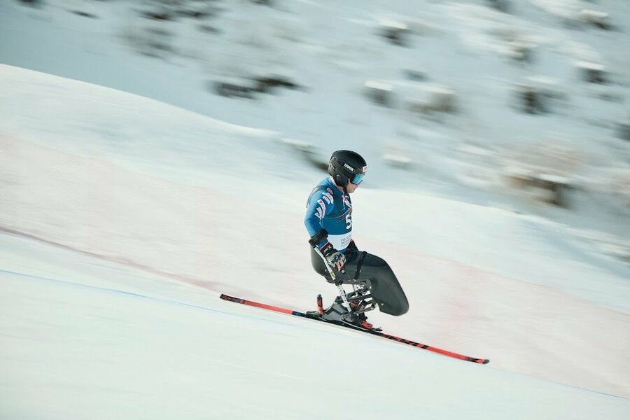 パラアルペンスキーワールド杯でパフォーマンスダンパーを搭載したチェアスキーで滑走する鈴木猛史選手