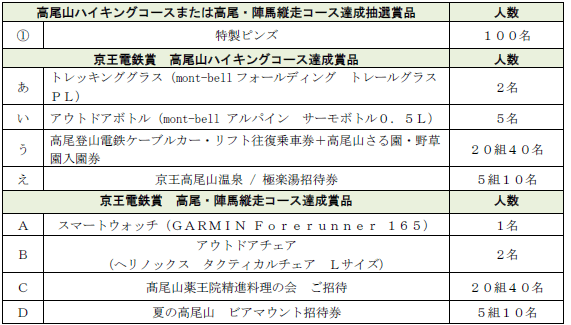 高尾山ハイキングコース、または高尾・陣馬縦走コース達成で特製ピンズに応募できます。さらにそれぞれのコースを達成すると、対象コースの京王電鉄賞に応募もできます。