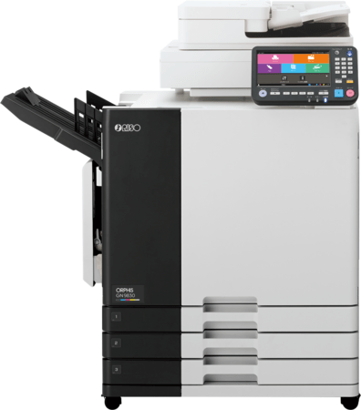 プリント1枚あたりの消費電力量が従来機に比べ大幅に低減しました。GN9830/GN9831は0.055Wh/枚、GN7630は0.064Wh/枚、GN9830プレミアムは0.063Wh/枚となっており、高速プリントを省電力で処理することができます。