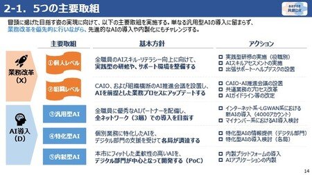 市のAI利活用を抜本的に進めることを目的に、全国でも数少ないAIに関する実行計画を策定するとともに、その推進リーダー(CAIO)として本市のデジタル政策監を任命しました。本プランは、「あまがさき共創DXプラン2.0(※2)」の下位計画に位置し、単なるAI導入ではなく、その利活用とプロセス改革に重点を置き、目標値(KPI)の設定も行った点が特徴となっています。具体的には、AIのアクティブ利用課を100%にするとともに、全庁共通業務の全てに対してプロセス改革を進めていきます。