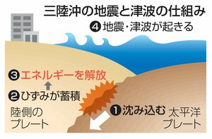 20日に青森県で震度5強を観測した三陸沖の地震は、太平洋プレートが陸側のプレートの下に沈み込み、ひずみが蓄積されやすい海域で発生した。過去にも規模の大きな地震が続発した領域で、昨年11月には、やや南側でマグニチュード(M)6・9の地震が発生し津波を観測した。政府の地震調査委員会の長期評価では、超巨大地震の発生も懸念されている。