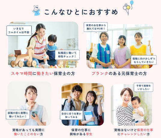 こうした中、保育士の登録者数は令和4年度末時点で約190万人にのぼる一方、実際に従事している人は約70万人前後にとどまっています。そのため、保育施設の持続可能な運営に向けては、保育資格を持ちながらもフルタイム勤務は難しい保育士、ブランクのある元保育士、現場での実戦経験を望む保育学生、保育の仕事に興味を持つ子育て経験者など、保育現場を支える力になり得る人材と保育施設の接点を広げていくことが重要です。