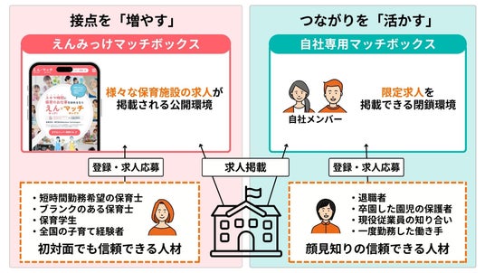 当社とリンクは、こうした人材と保育施設との接点を広げることに加え、保育施設がこれまで築いてきた信頼できる保育人材とのつながりも活かしながら、施設ごとの状況に応じた人材活用を支援していくため、「えんみっけマッチボックス」を開始しました。
