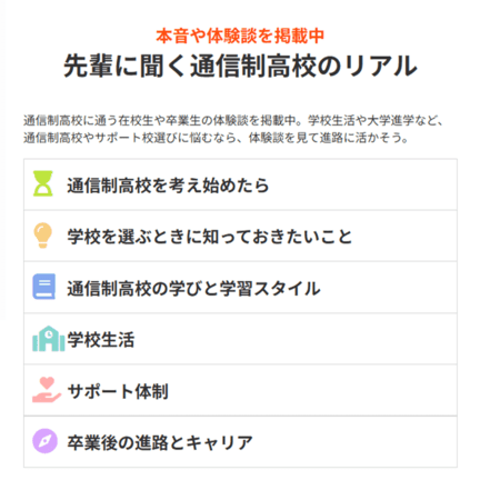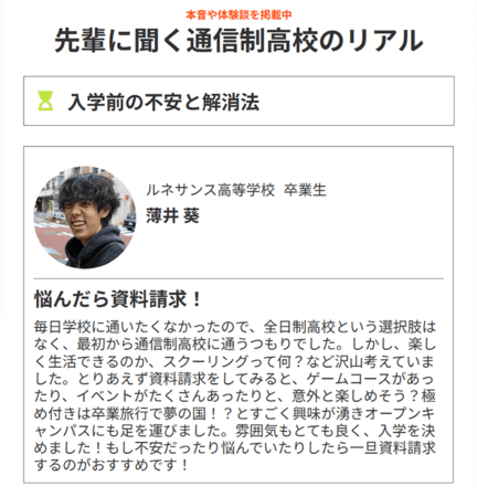 そこで「先輩に聞く通信制高校のリアル」では通信制高校への入学を考え始めた時から卒業後の進路まで、時系列でインターン(通信制高校の先輩)のコメントを紹介しています。このコメントは「先輩たちはどのようなことに不安を覚え、それをどう解消したか」という体験談であり、入学検討者へのアドバイスになっています。