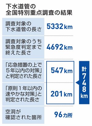 国土交通省は4月21日、全国の自治体に要請した下水道管調査で、腐食や損傷が激しく、対策が必要な管路が全47都道府県で計748キロに上ったと公表した。調査結果が判明した下水道管の16%に当たり、道路陥没につながるリスクもある。このうち201キロは、1年以内の対策が必要となる深刻な状態だった。判定が終わっていない区間も残っており、速やかな報告を求める。