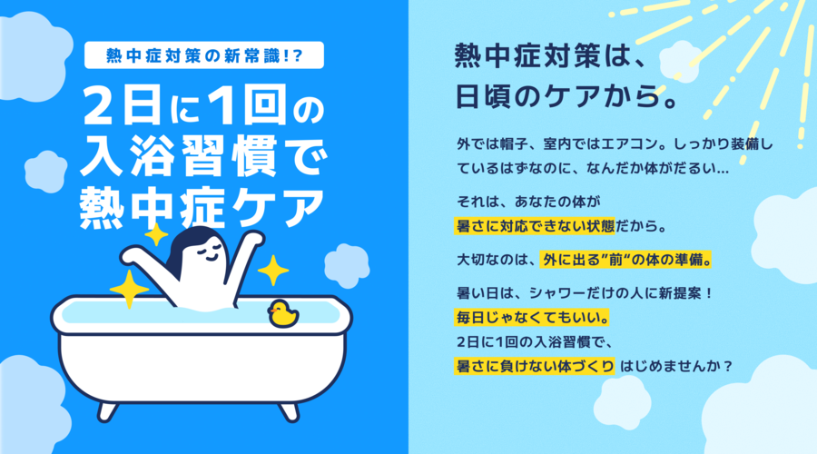 当サイトでは、熱中症のしくみや熱中症対策における「入浴習慣」の有用性に着目した研究結果等を公開し、人々の熱中症リスク低減に貢献いたします。また、今後も様々な最新研究結果を順次公開していきます。