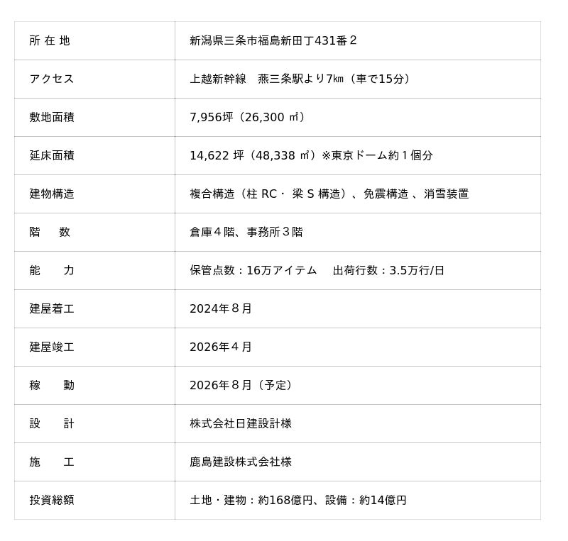 新潟県三条市にある、既存の当社ホームセンタールート向け物流センター「HC東日本物流センター」は、ホームセンター様への売上拡大に伴い、在庫保管能力や出荷能力が最大値に達しつつあり、より効率的な作業環境を構築するとともに、ホームセンター様をはじめ、より多くのお客様のニーズにお応えするため、移転を決定いたしました。