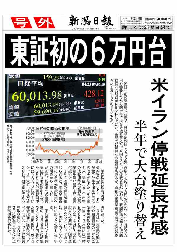 【号外】日経平均株価が史上初の6万円超え 2026/4/23 10:10 (最終更新: 2026/4/23 10:12) PDFで号外を見る トップページで最新情報を見る 関連ニュース 【号外】米イラン即時停戦合意 4/8 【号外】センバツ高校野球、日本文理8強ならず 3/25 【号外】帝京長岡初戦敗退 3/23 【号外】センバツ高校野球、日本文理初戦快勝 3/21 【号外】新潟水俣病8人全員認定、新潟地裁判決 3/12 【号外】旧統一教会に高裁が解散命令 3/4 【号外】米、イスラエル両軍がイラン攻撃 2/28 【号外】フィギュア女子で中井亜美(新潟市出身)が「銅」! 2/20 【号外】フィギュアペア・りくりゅう金メダル!日本勢初 2/17 【号外】スノボ男子HPで戸塚が金、山田が銅、平野(歩)は7位 2/14 【号外】スノーボード女子ビッグエアで村瀬心椛が「金」 2/10 【号外】スノーボード男子ビッグエアで木村葵来が金、木俣は銀 2/8